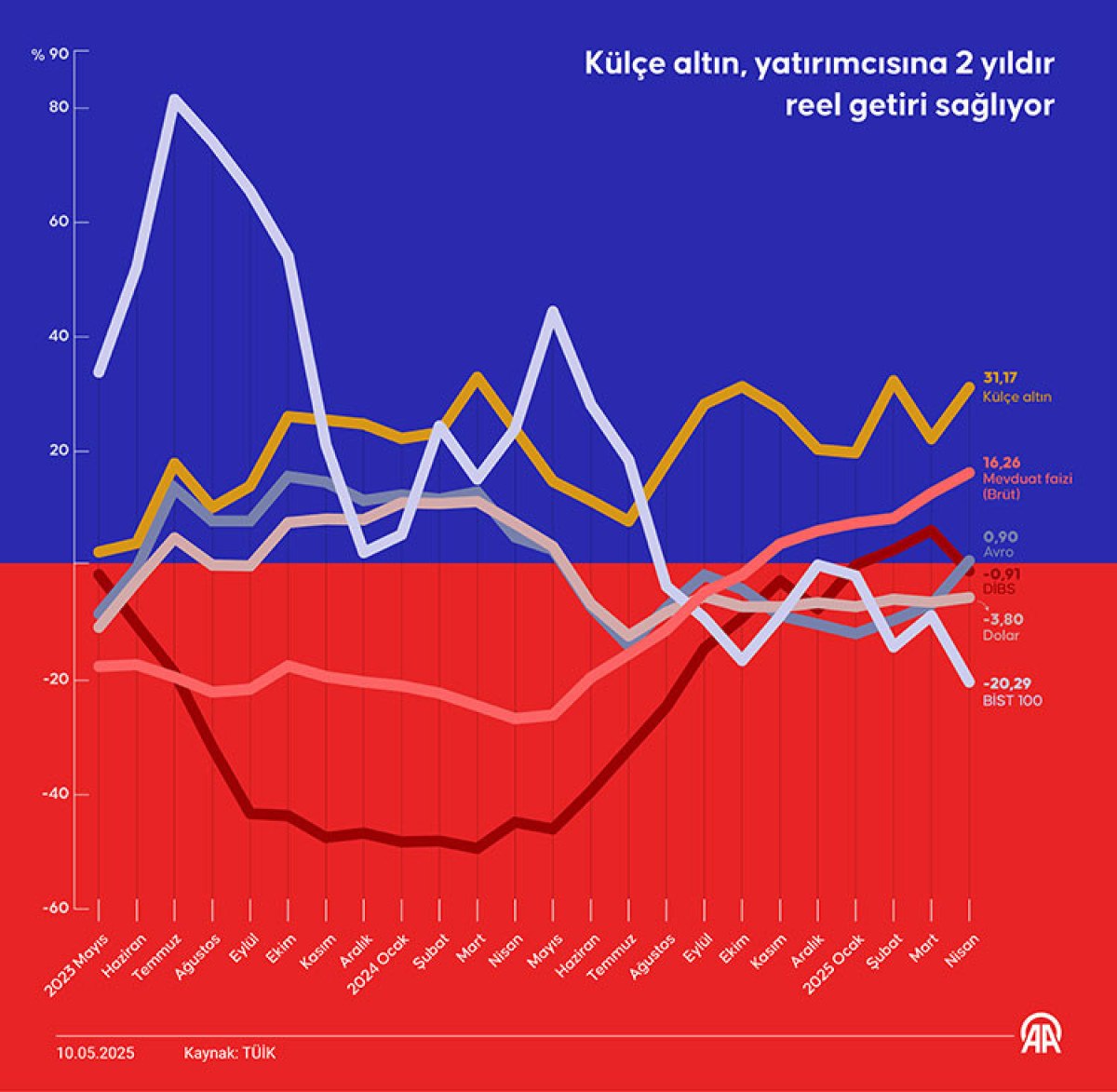 Buna göre, nisanda yıllık bazda Yİ-ÜFE ile indirgendiğinde, yatırım araçlarından külçe altın yüzde 31,17, mevduat faizi (brüt) yüzde 16,26 ve euro yüzde 0,90 oranlarında yatırımcısına reel getiri sağladı.