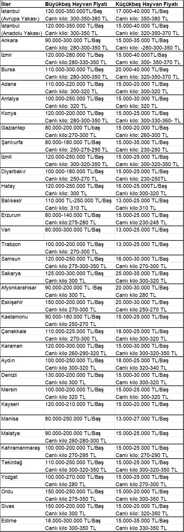 Büyükşehirlerde fiyatlar konusunda da bilgi veren Bayraktar, “İstanbul Avrupa yakasında büyükbaş fiyatları 300-380 lira, Anadolu yakasında 300-350 lira arasında değişiyor. Ankara ve İzmir’de ise 280-350 lira seviyelerinde seyrediyor. Küçükbaş fiyatları ise İstanbul Avrupa yakasında 350-380 lira, Anadolu yakasında 320-370 lira, Ankara’da 280-350 lira, İzmir’de 300-370 lira arasında” ifadelerini kullandı.