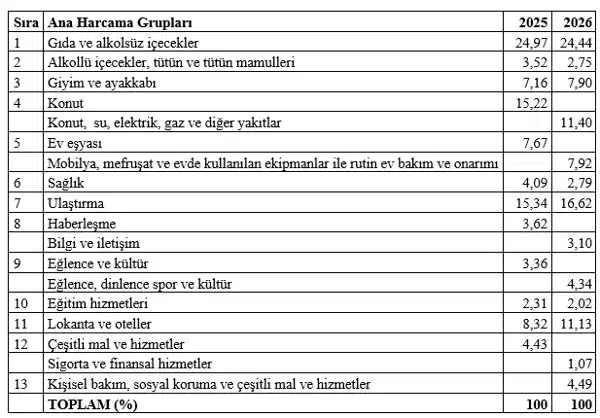 Ağırlığı artan gruplar arasında lokanta ve oteller öne çıktı. Bu grubun ağırlığı 2025 yılında yüzde 8,32 iken 2026 yılında yüzde 11,13’e yükseltildi. Eğilmez, bu artışın söz konusu sektördeki yüksek fiyat artışlarıyla uyumlu olduğunu belirtti.
