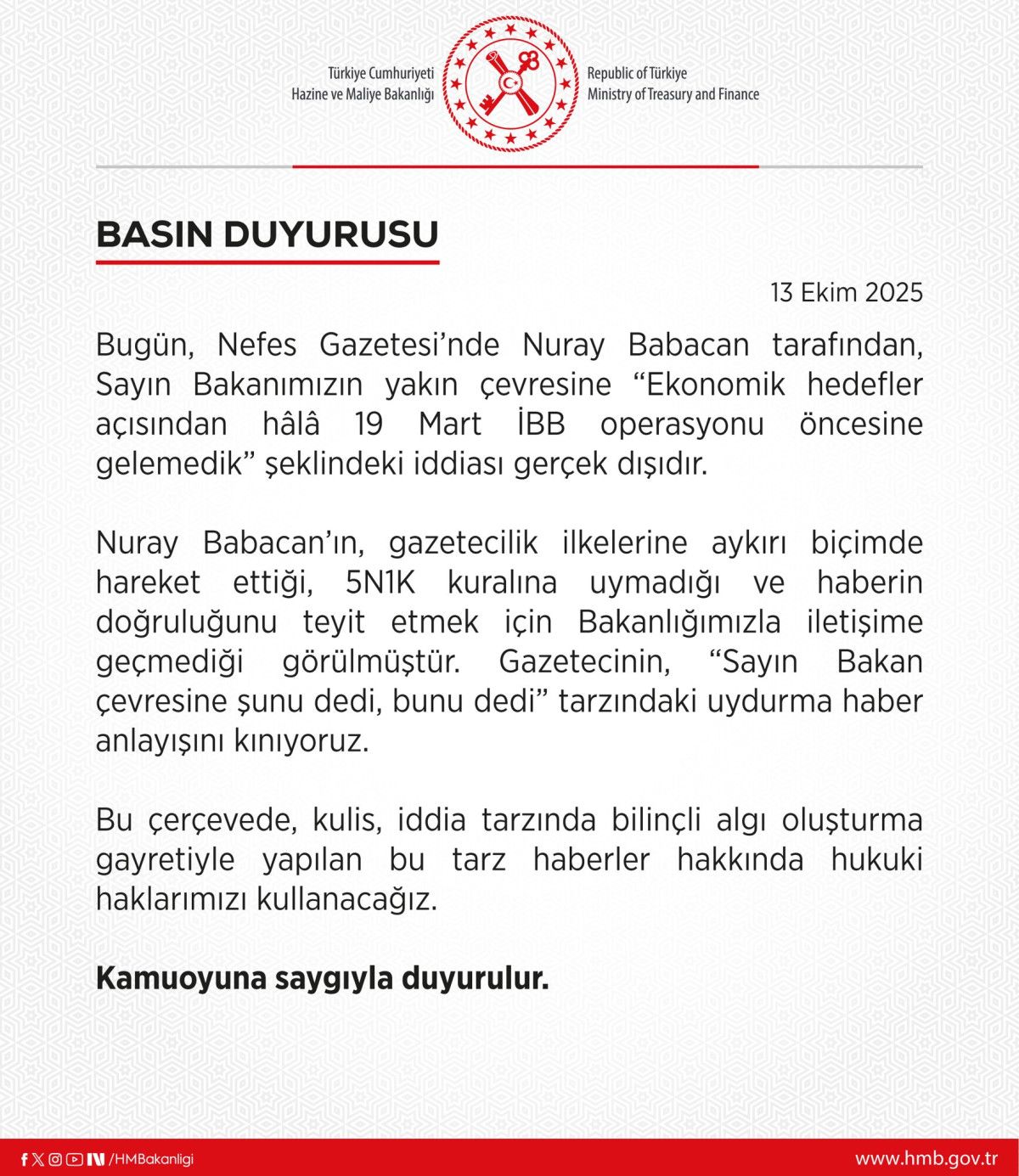 “Bugün, Nefes Gazetesi’nde Nuray Babacan tarafından, Sayın Bakanımızın yakın çevresine ‘Ekonomik hedefler açısından hâlâ 19 Mart İBB operasyonu öncesine gelemedik’ şeklindeki iddiası gerçek dışıdır.
