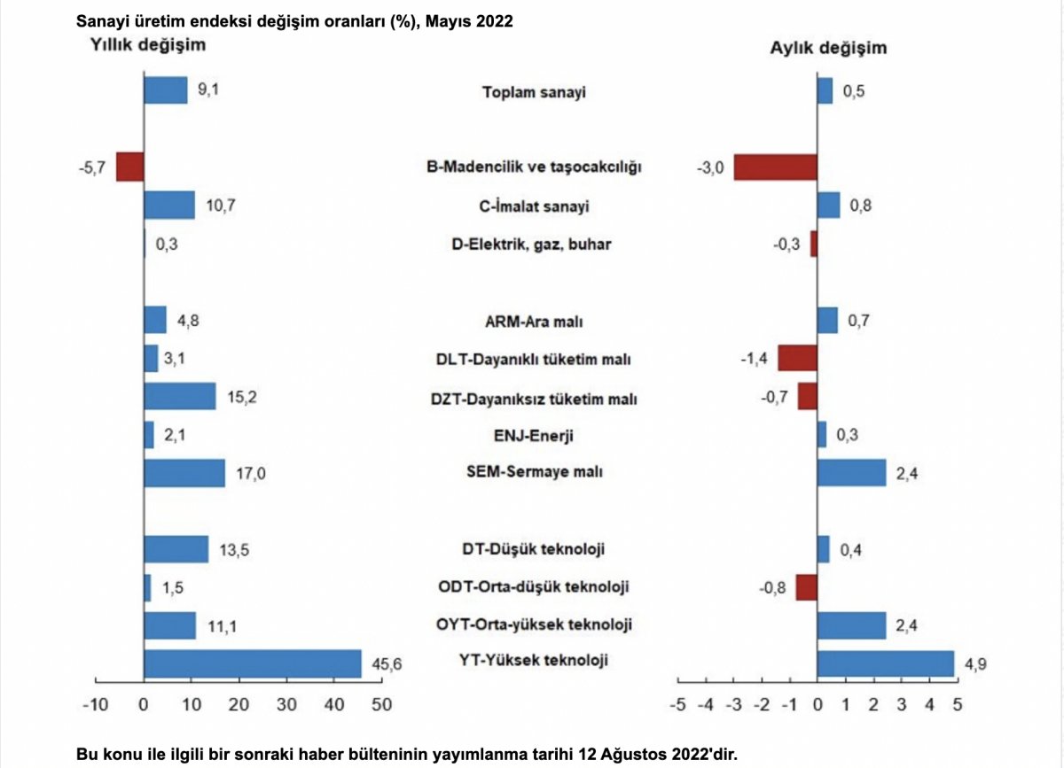Sanayinin alt sektörleri incelendiğinde, 2022 yılı Mayıs ayında madencilik ve taşocakçılığı sektörü endeksi bir önceki aya göre yüzde 3 azaldı, imalat sanayi sektörü endeksi yüzde 0,8 arttı ve elektrik, gaz, buhar ve iklimlendirme üretimi ve dağıtımı sektörü endeksi yüzde 0,3 azaldı.