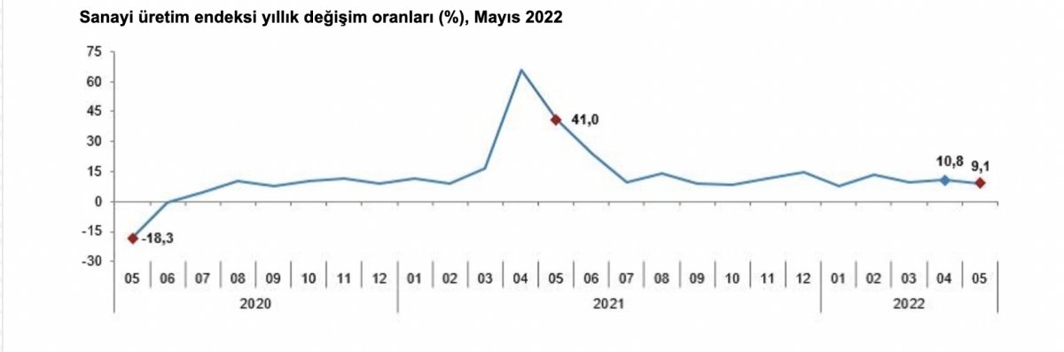 Sanayinin alt sektörleri incelendiğinde, 2022 yılı Mayıs ayında madencilik ve taşocakçılığı sektörü endeksi bir önceki yılın aynı ayına göre yüzde 5,7 azalırken, imalat sanayi sektörü endeksi yüzde 10,7 ve elektrik, gaz, buhar ve iklimlendirme üretimi ve dağıtımı sektörü endeksi yüzde 0,3 arttı.