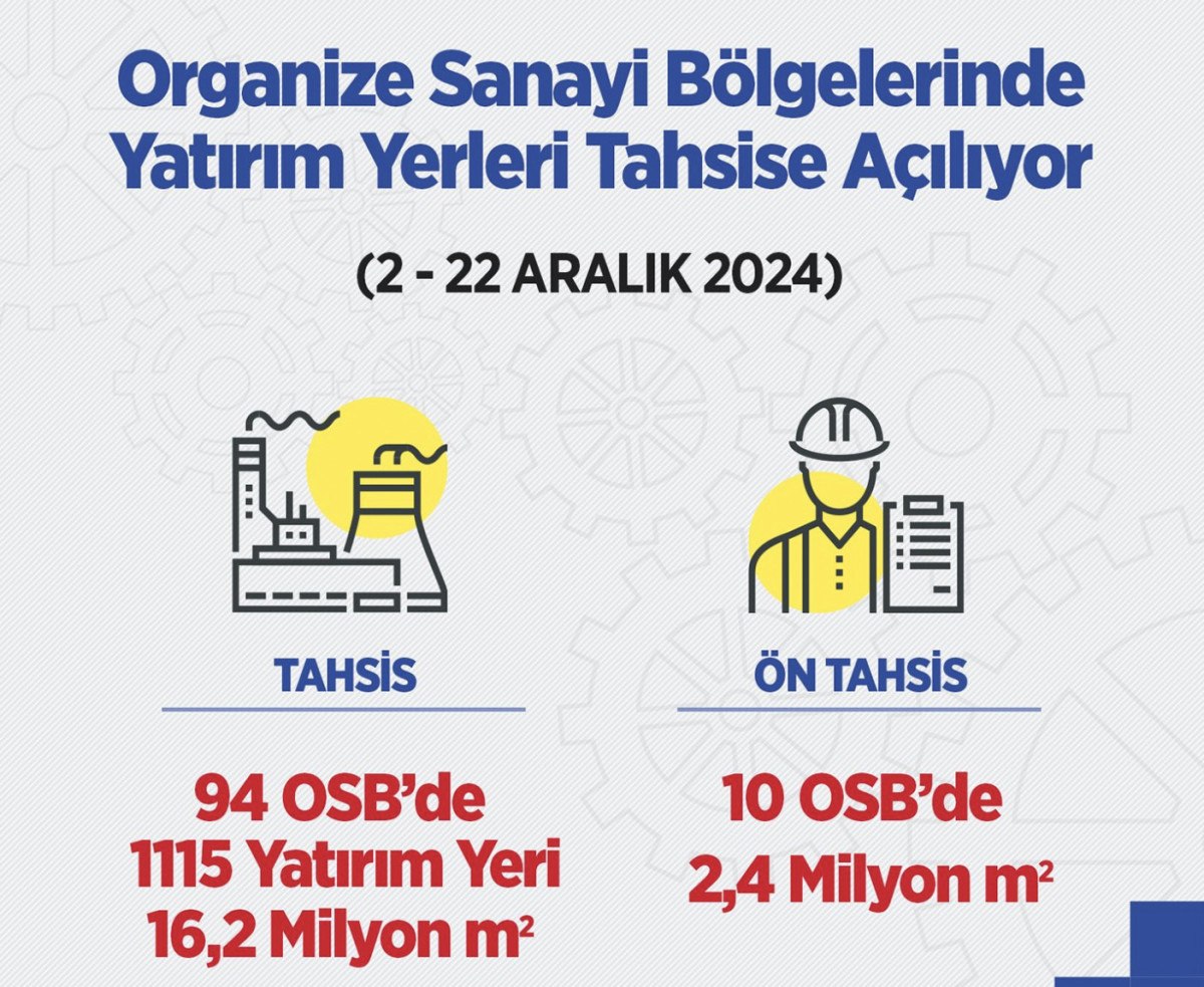 Bu ay çıktığımız üçüncü ilanla, 94 OSB’de 16,2 milyon metrekare büyüklüğündeki toplam 1.115 yatırım yerini tahsis başvurularına, 10 OSB’de 2,4 milyon metrekare alanı ön tahsis başvurularına açtık.