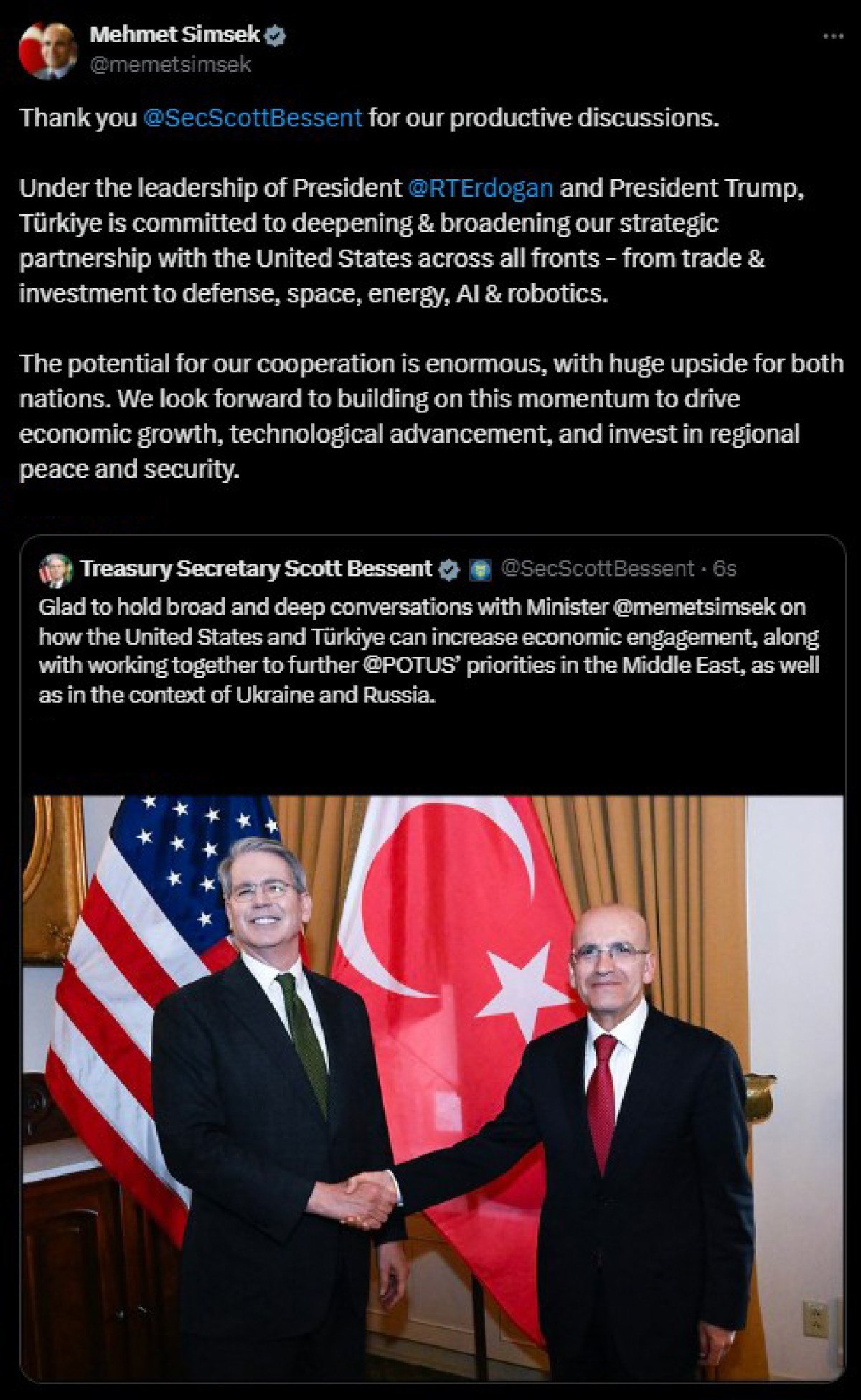Bessent’e verimli görüşme için teşekkür eden Şimşek, “Türkiye, Cumhurbaşkanı Erdoğan ve Başkan Trump’ın liderliğinde ticaret ve yatırımdan savunma, uzay, enerji, yapay zeka ve robotiğe kadar tüm alanlarda ABD ile stratejik ortaklığı derinleştirmeye ve genişletmeye kararlıdır” ifadelerini kullandı.