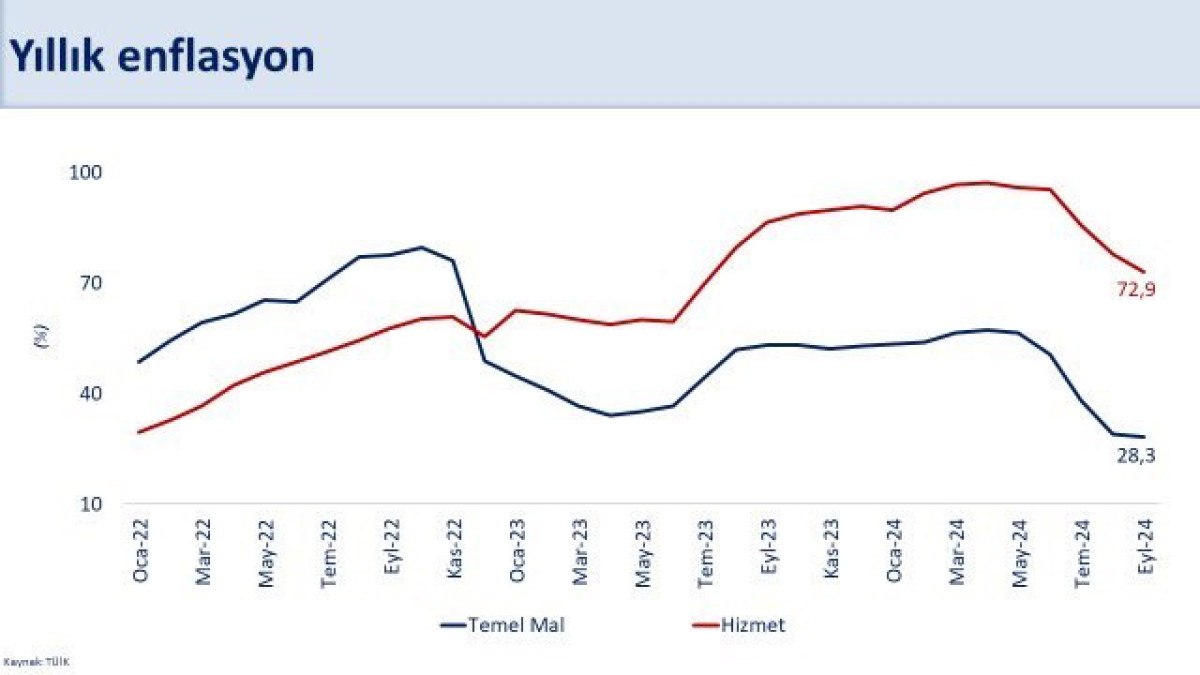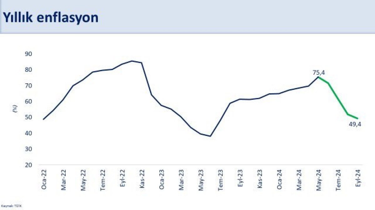 Eylülde yıllık enflasyon bir önceki aya göre 2,6 puan düşüşle yüzde 49,4’e geriledi. Temel mal enflasyonu yıllık yüzde 28,3 ile görece düşük seviyedeyken geriye dönük fiyatlama davranışı kaynaklı katılık, hizmet enflasyonunda düşüşün yavaş gerçekleşmesine neden oluyor.