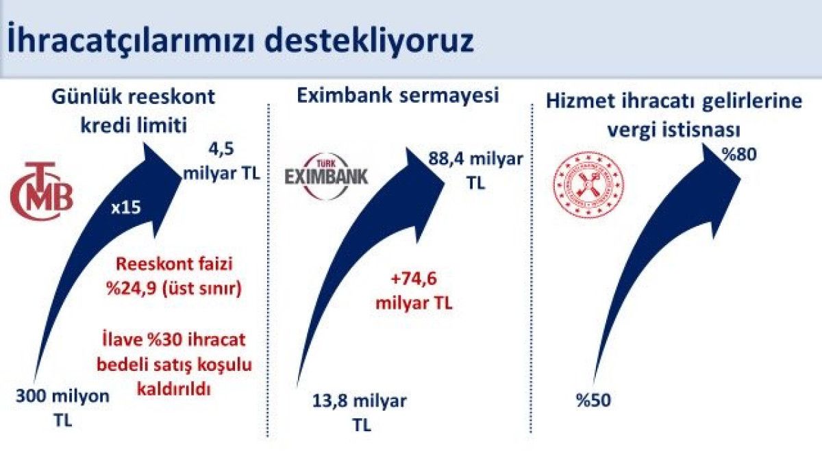 Yabancı para reeskont toplam limiti 1 milyar dolara çıkarıldı. Eximbank’ın sermayesi 5 kattan fazla artışla 88,4 milyar TL’ye ulaştı. Bu sene Eximbank’ın ihracatçılarımıza nakdi ve gayrinakdi toplam 53 milyar dolar destek sağlamasını bekliyoruz. Küresel değer zincirlerinde daha üst sıralara çıkmak için ihracatı ve katma değerli üretimi desteklemeyi kararlılıkla sürdüreceğiz.”