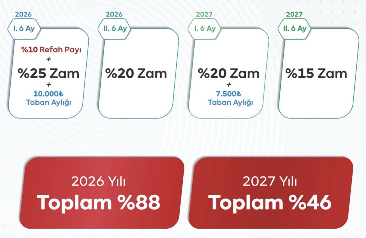 Memur-Sen, 2026 yılı birinci dönemi için yüzde 25 oranında zam, yüzde 10 refah payı ve 10 bin TL taban aylık artışı istiyor. Aynı yılın ikinci dönemi için ise yüzde 20 oranında zam talep ediliyor.