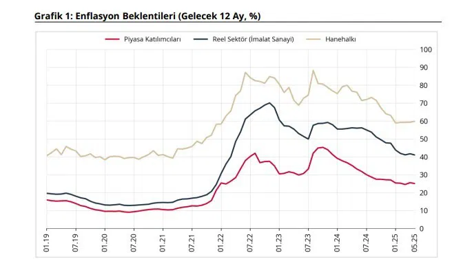 Buna göre, 2025 yılı mayıs ayında 12 ay sonrası için yıllık enflasyon beklentileri, piyasa katılımcılarında bir önceki aya göre 0,5 puan azalarak yüzde 25,1 seviyesine geriledi. Reel sektörün beklentisi ise 0,7 puan düşüşle yüzde 41,0 olarak kaydedildi. Buna karşılık hanehalkı beklentisi 0,6 puan artarak yüzde 59,9 oldu.