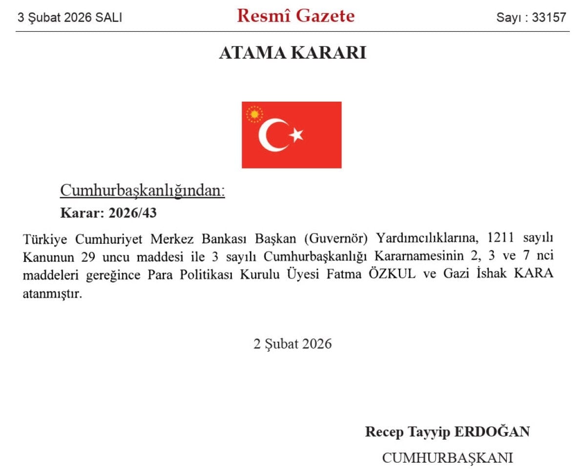Cumhurbaşkanı Recep Tayyip Erdoğan’ın imzasıyla yayımlanan karara göre Merkez Bankası’nda başkan yardımcılıklarına Fatma Özkul ile Gazi İshak Kara atandı.