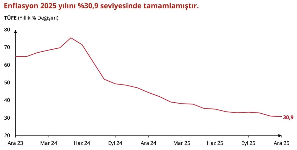 2025 yılında yıllık enflasyonun %30,9 seviyesinde tamamladığına dikkat çekildi ve enflasyondaki düşüş eğiliminin genişlediği vurgulandı.