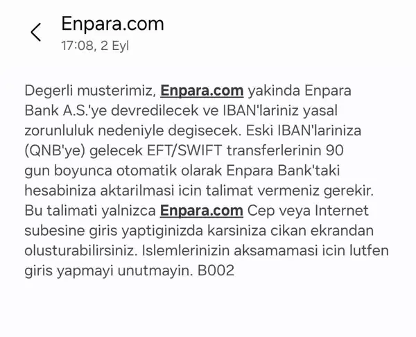 Banka, sürecin başlamasına bir hafta kala müşterilere SMS gönderdi. Mesajda, IBAN değişikliğinin yasal zorunluluk olduğu belirtilirken eski IBAN’lara yapılacak EFT ve SWIFT transferlerinin 90 gün boyunca otomatik olarak yeni hesaplara aktarılacağı duyuruldu. Bunun için müşterilerin Enpara Cep Şubesi veya internet şubesine giriş yapıp yönlendirme talimatı vermesi gerekiyor.