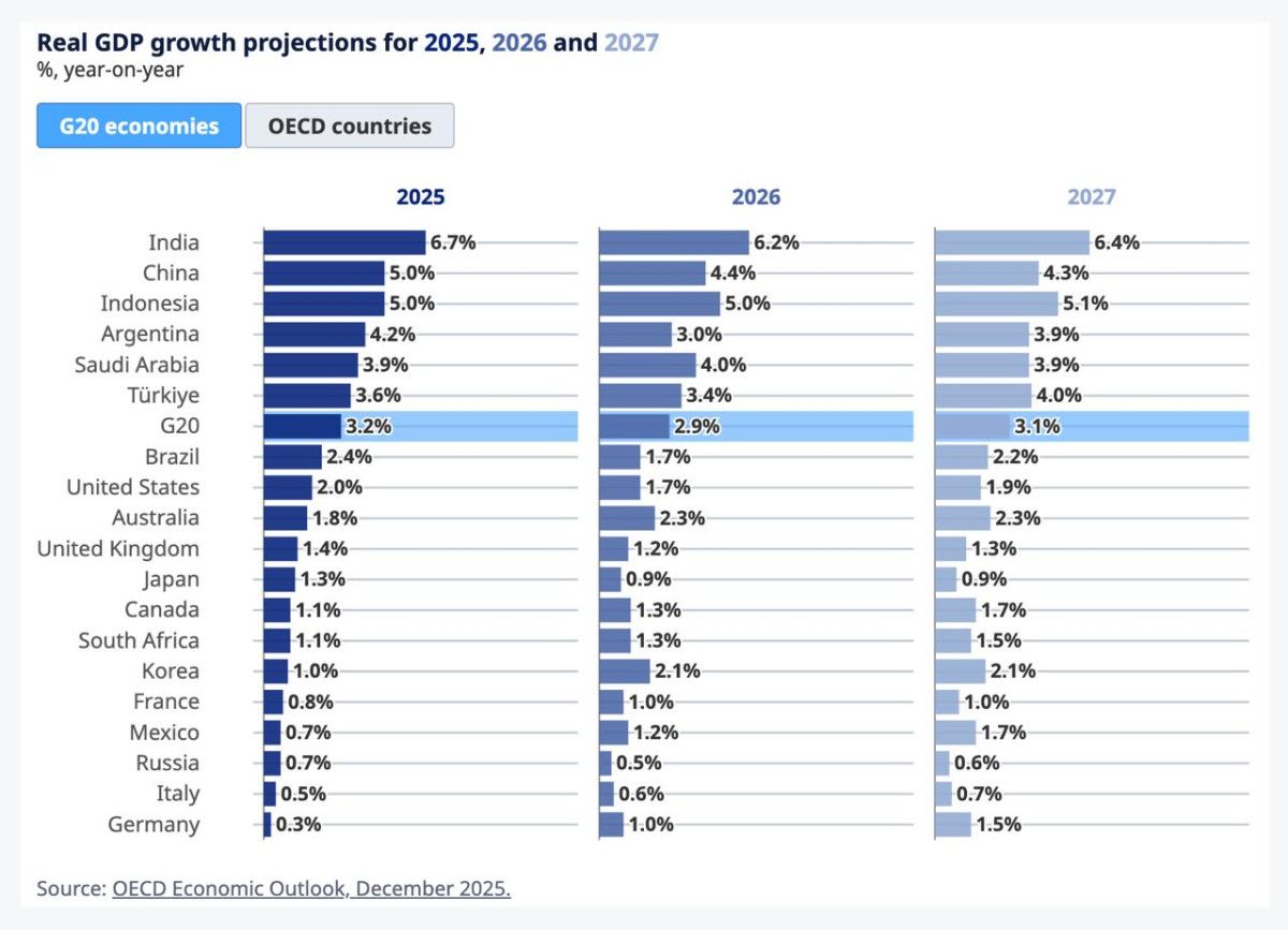 OECD, “Dayanıklı Büyüme Ancak Artan Kırılganlıklarla Birlikte” başlıklı Ekonomik Görünüm raporunu yayımladı. Raporda, küresel ekonomide bu yıl, 2026 ve 2027’ye ilişkin büyüme, enflasyon tahminleri yer alırken, gümrük tarifelerinin küresel ekonomideki etkileri analiz edildi.