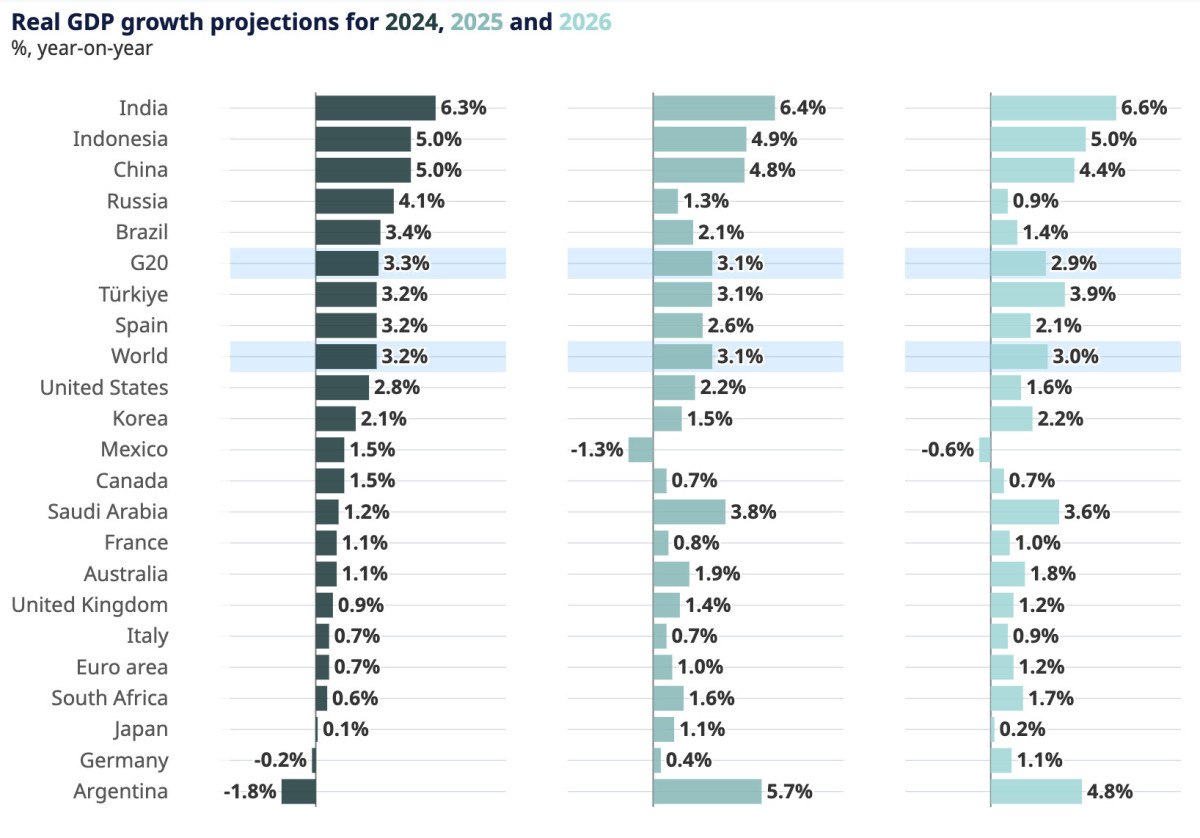 Küresel GSYİH büyümesinin 2024’te yüzde 3,2’den 2025’te yüzde 3,1’e ve 2026’da yüzde 3’e düşmesi, çeşitli G20 ekonomilerindeki daha yüksek ticaret engelleri ve artan politika belirsizliğinin yatırım ve hanehalkı harcamalarını etkilemesi bekleniyor.