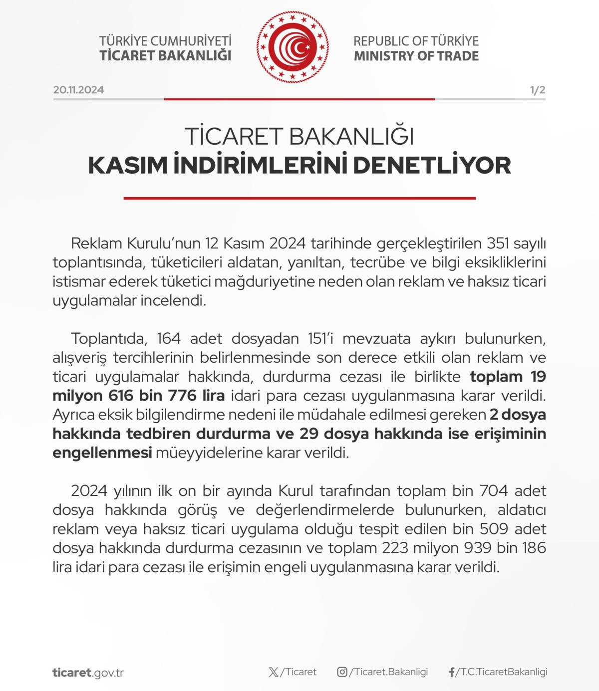 2024 yılının ilk 11 ayında Kurul tarafından toplam 1.704 adet dosya hakkında görüş ve değerlendirmelerde bulunurken, aldatıcı reklam veya haksız ticari uygulama olduğu tespit edilen 1.509 adet dosya hakkında durdurma cezasının ve toplam 223 milyon 939 bin 186 lira idari para cezası ile erişimin engeli uygulanmasına karar verildi.