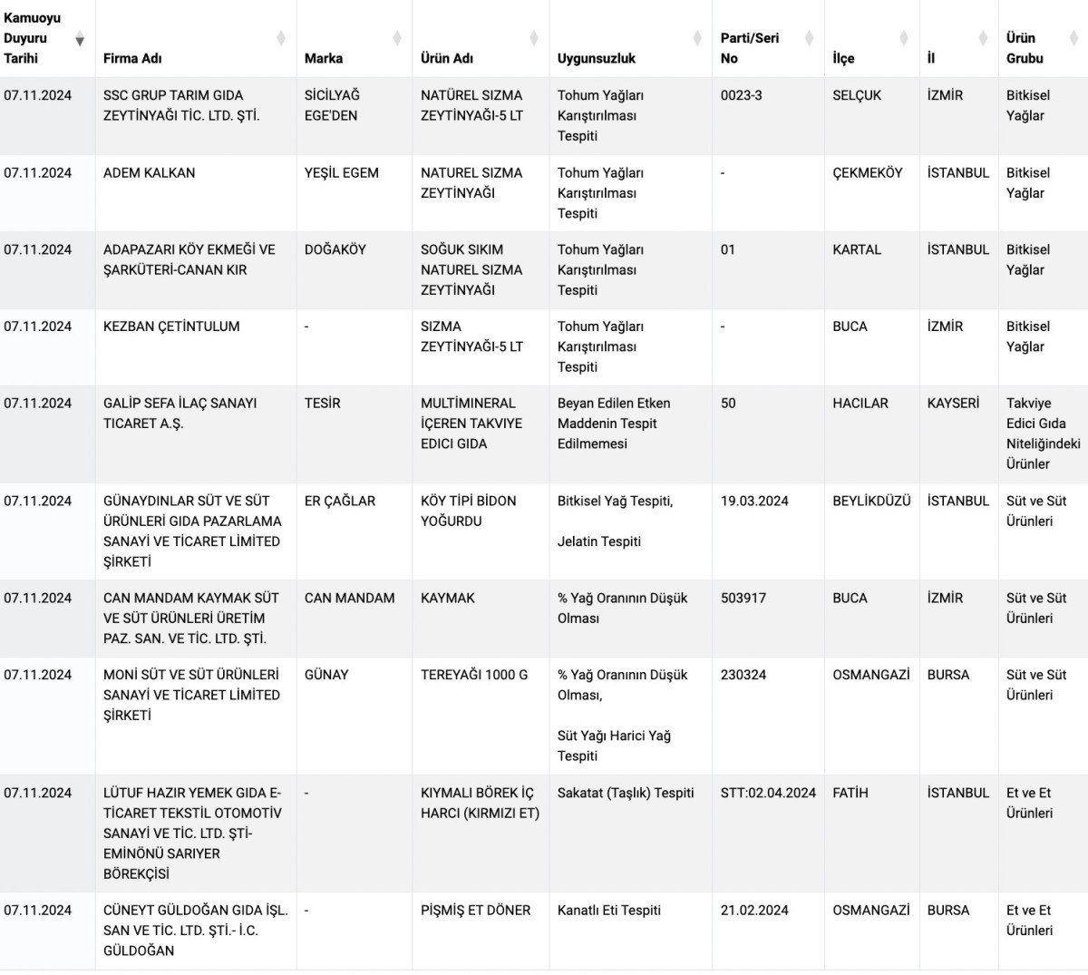 Taklit veya Tağşiş Yapılan Gıdalar listesine de 12 firma katıldı ve burada da sakıncalı ürün sayısı 733’e çıktı.