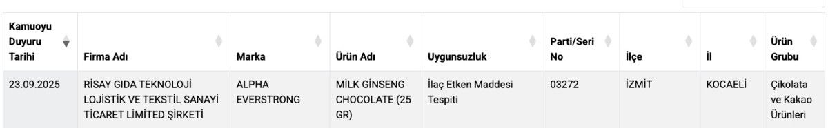 Tarım ve Orman Bakanlığı’nın sağlığı tehlikeye atan firmalar listesine Kocaeli’den giren Risay Gıda Teknoloji Lojistik ve Tekstil Sanayi Ticaret Limited Şirketi, Alpha everstrong markalı, 25 gram “milk ginseng chocolate” ürününde “ilaç etken maddesi” tespit edildi.