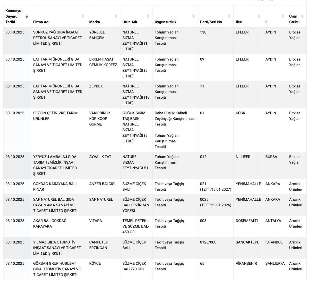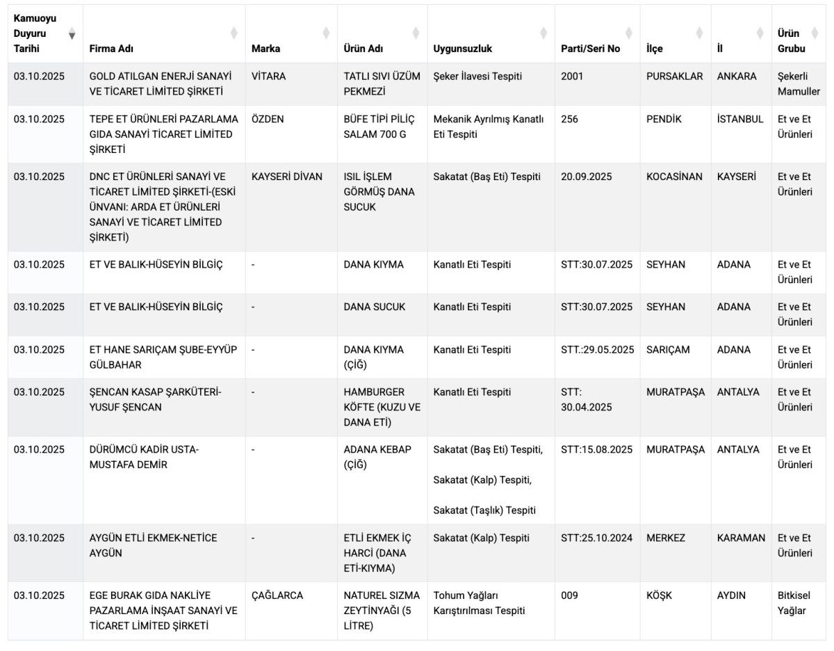 Tarım ve Orman Bakanlığı’nın sağlığı tehlikeye atan firmalar listesi ile Aynı Değeri Taşımayan Madde Eklenmesi İle Oluşturulan Taklit Veya Tağşiş Yapılan Gıdalar Listesindeki ihlallere yenileri eklendi.