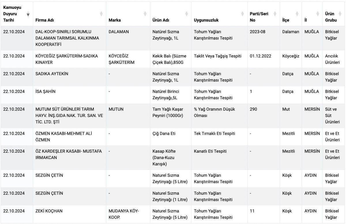 Tarım ve Orman Bakanlığı’nın Sağlığı Tehlikeye Düşürecek Gıdalar listesine 22 Ekim’de 5 ürün daha eklendi.