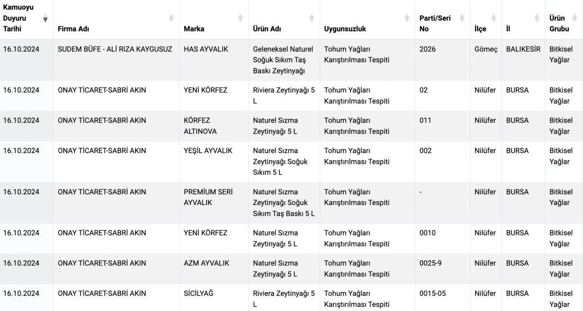 Listeye yeni katılan firmalar, zeytinyağına tohum yağları karıştırdı. Bu firmalar Balıkesir ve Bursa’da tespit edildi.