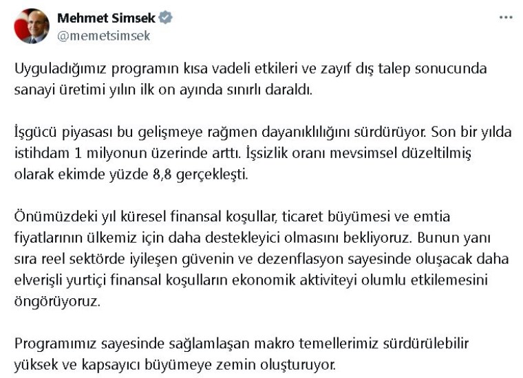 Hazine ve Maliye Bakanı Mehmet Şimşek, “Uyguladığımız programın kısa vadeli etkileri ve zayıf dış talep sonucunda sanayi üretimi yılın ilk 10 ayında sınırlı daraldı. İş gücü piyasası bu gelişmeye rağmen dayanıklılığını sürdürüyor” dedi.