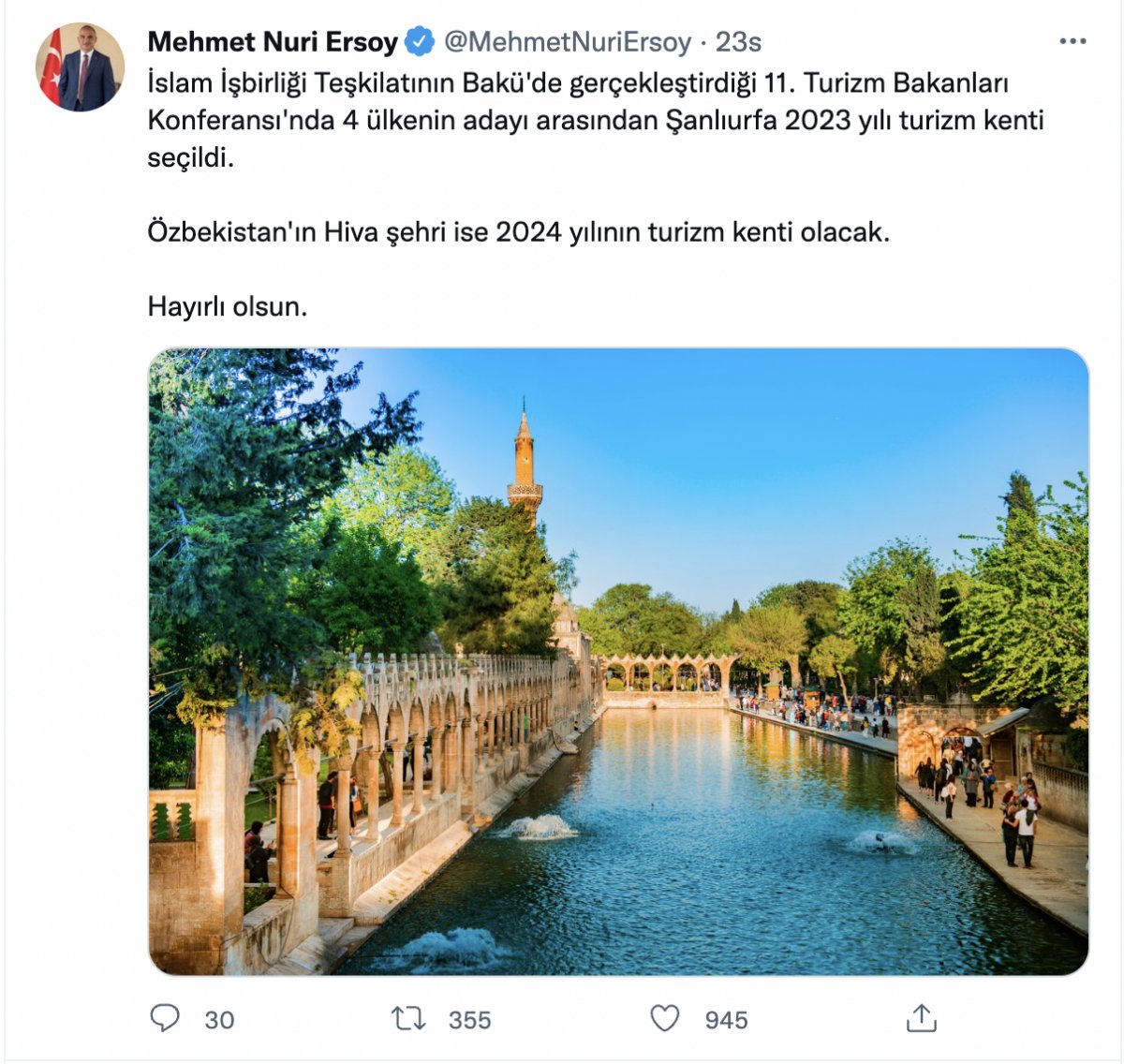 İslam İşbirliği Teşkilatı’nın Bakü’de gerçekleştirdiği 11. Turizm Bakanları Konferansı’nda 4 ülkenin adayı arasından Şanlıurfa 2023 yılı turizm kenti seçilirken, Özbekistan’ın Hiva şehri ise 2024 yılının turizm kenti olacak.