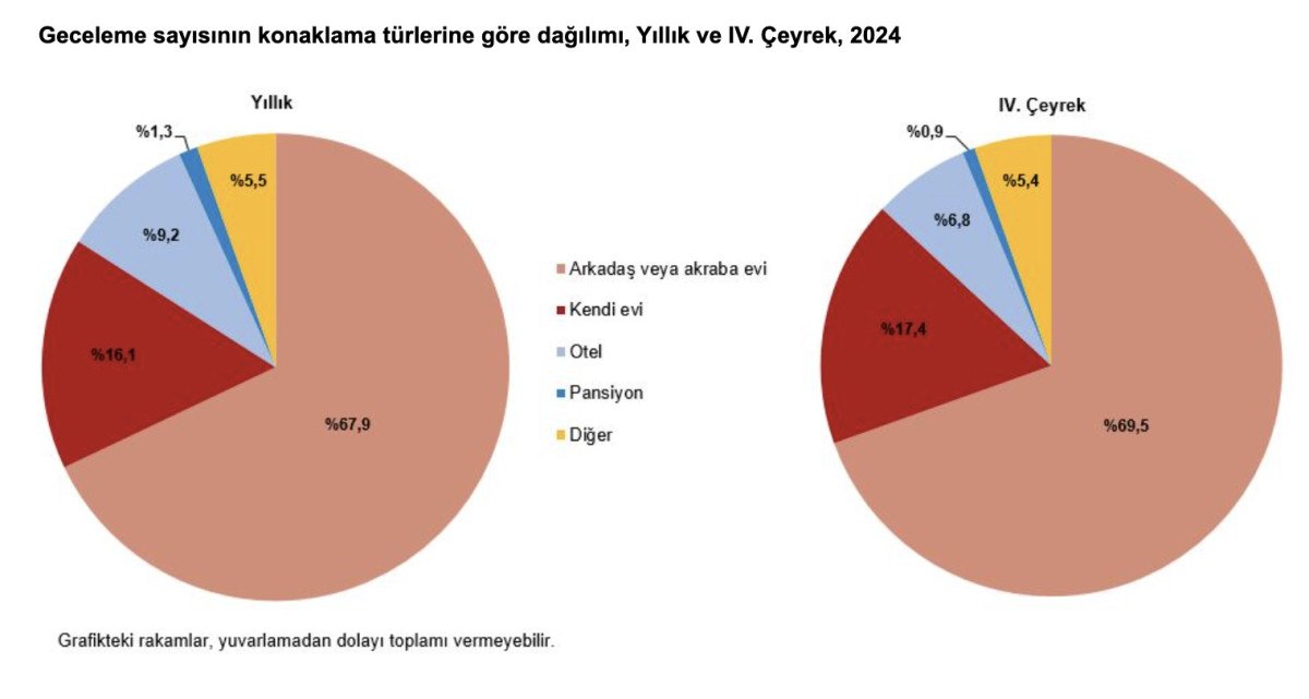 İkinci sırada 77 milyon 911 bin geceleme ile “kendi evi” yer alırken, “otel” 44 milyon 516 bin geceleme sayısı ile üçüncü sırada yer aldı.