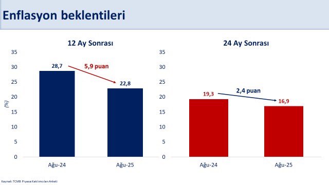 Hazine ve Maliye Bakanı Mehmet Şimşek, sosyal medya hesabında yaptığı paylaşımda Merkez Bankası’nın ağustos ayı Piyasa Katılımcıları Anketi sonuçlarını değerlendirdi. Piyasanın 12 ay ve 24 ay sonrası enflasyon beklentilerinin gerilediğine işaret eden Bakan Şimşek, “Gerçekleşmelere duyarlı olan beklentilerin, enflasyon düştükçe Merkez Bankası tahminlerine daha da yakınsamasını öngörüyoruz. Bu sayede azalan katılıklar, dezenflasyona ilave destek sağlayacaktır” ifadelerini kullandı.