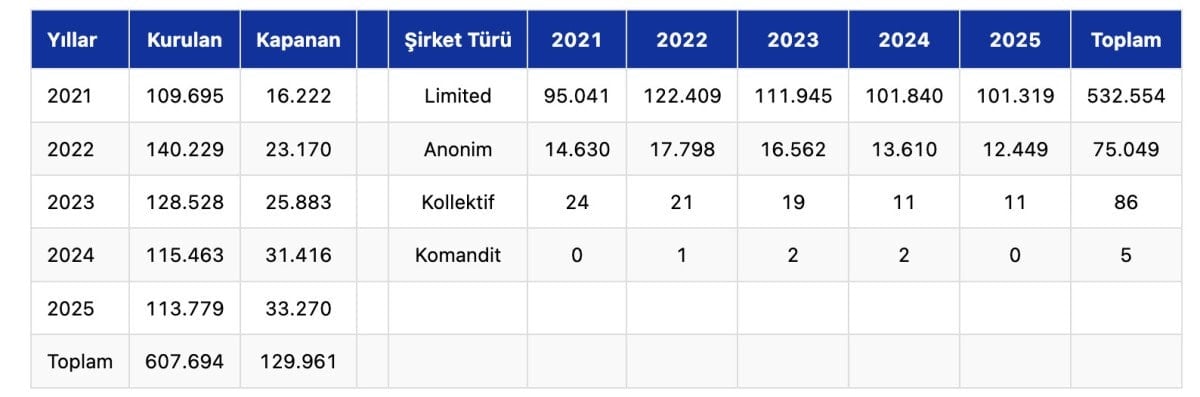 Son 5 yılda kurulan ve kapanan şirket sayıları ve kurulan şirketlerin türlerine ilişkin veriler şu şekilde: