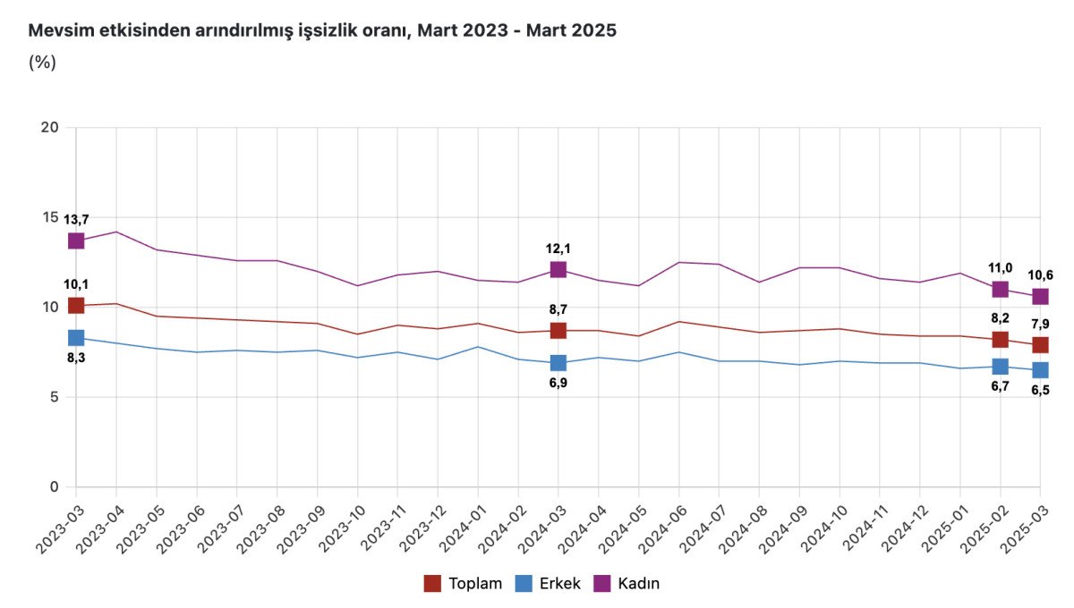 Mevsim etkisinden arındırılmış işsizlik oranı yüzde 7,9 seviyesinde gerçekleşti.