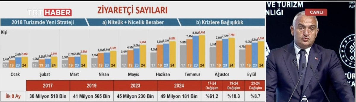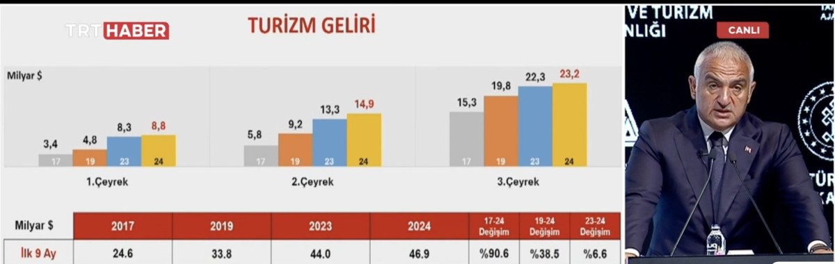 Ersoy’un verdiği bilgilere göre 9 ayda hem gecelik kalış süresi, hem harcama rakamı hem turizm sayısı hem de gelir arttı. Buna göre 9 aylık turizm geliri 46,9 milyar dolara ulaştı.