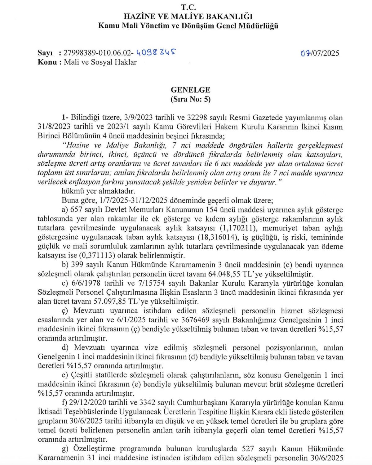 6/6/1978 tarihli ve 7/15754 sayılı Bakanlar Kurulu Kararıyla yürürlüğe konulan Sözleşmeli Personel Çalıştırılmasına İlişkin Esasların 3 üncü maddesinin ikinci fıkrasında yer alan ücret tavanı 57 bin 97,85 TL’ye yükseltildi.