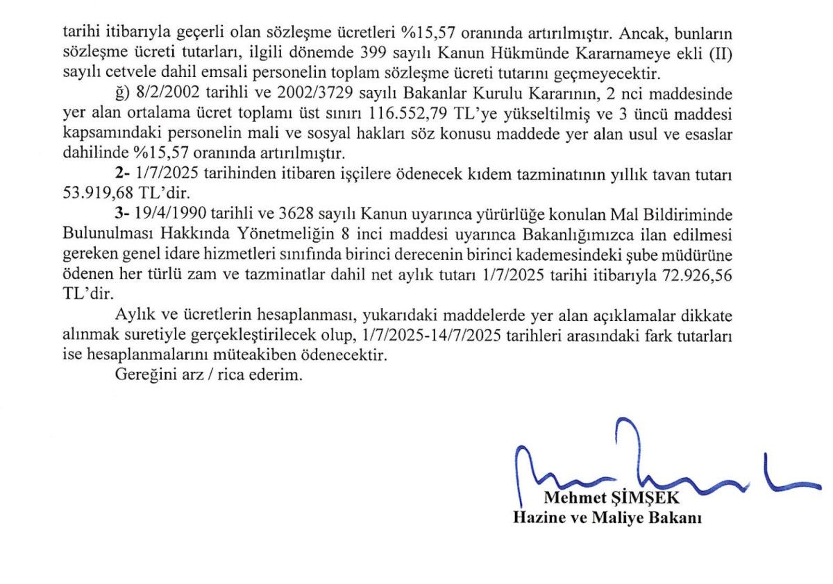 Aylık ve ücretlerin hesaplanması, yukarıdaki maddelerde yer alan açıklamalar dikkate alınmak suretiyle gerçekleştirilecek olup, 1/7/2025-14/7/2025 tarihleri arasındaki fark tutarları ise hesaplanmalarını müteakiben ödenecektir.