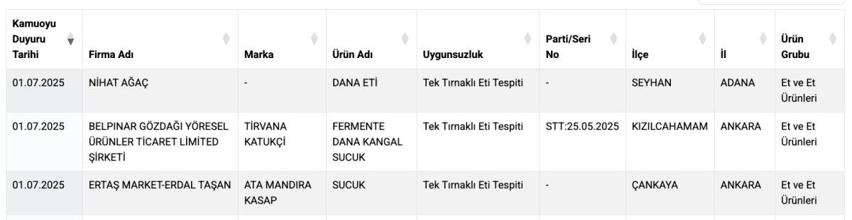 Ertaş Market’in Ata Mandıra Kasap markalı suçuğunda tek tırnaklı eti tespit edildi.