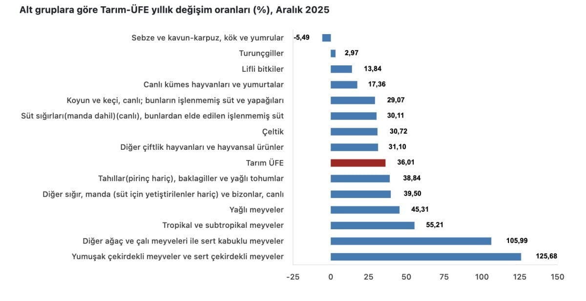 Ana gruplarda Aralık 2025’te bir önceki aya göre, tek yıllık bitkisel ürünler yüzde 8,57, canlı hayvanlar ve hayvansal ürünler yüzde 3,59 artarken, çok yıllık bitkisel ürünler yüzde 1,32 azaldı.
