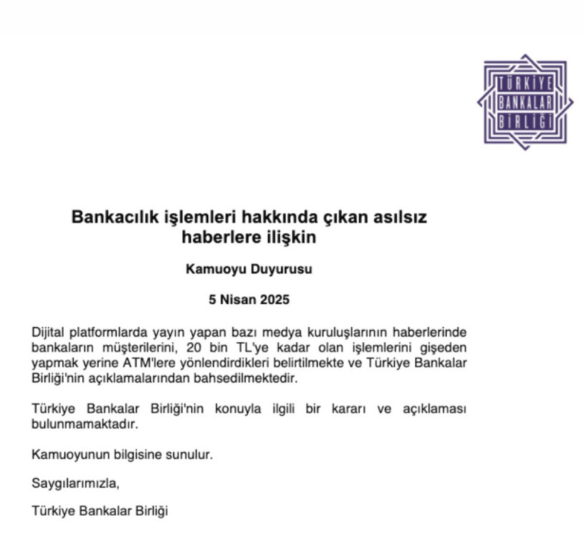 Dijital platformlarda yayın yapan bazı medya kuruluşlarının haberlerinde bankaların müşterilerini, 20 bin TL’ye kadar olan işlemlerini gişeden yapmak yerine ATM’lere yönlendirdikleri belirtilmekte ve Türkiye Bankalar Birliği’nin açıklamalarından bahsedilmektedir. Türkiye Bankalar Birliği’nin konuyla ilgili bir kararı ve açıklaması bulunmamaktadır.