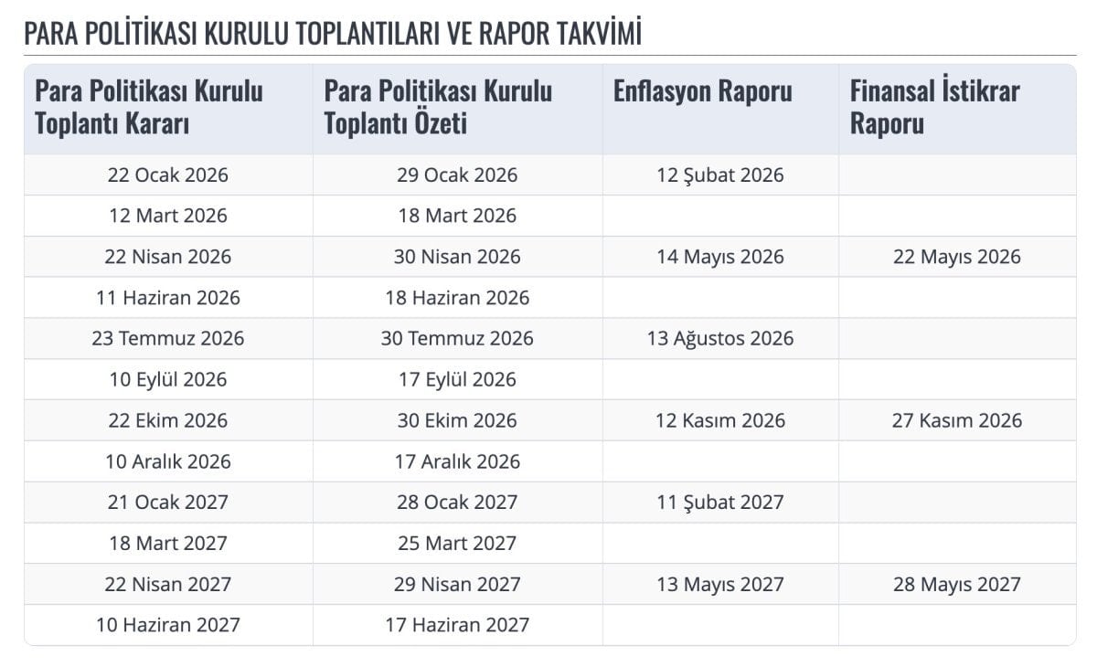 Türkiye Cumhuriyet Merkez Bankası, 2026’da yeni açıkladığı takvime göre 12 kez faiz açıklayacak, 12 kez toplantı özetini paylaşacak, 6 kez enflasyon raporu ve 3 kez de finans istikrar raporu sunacak.