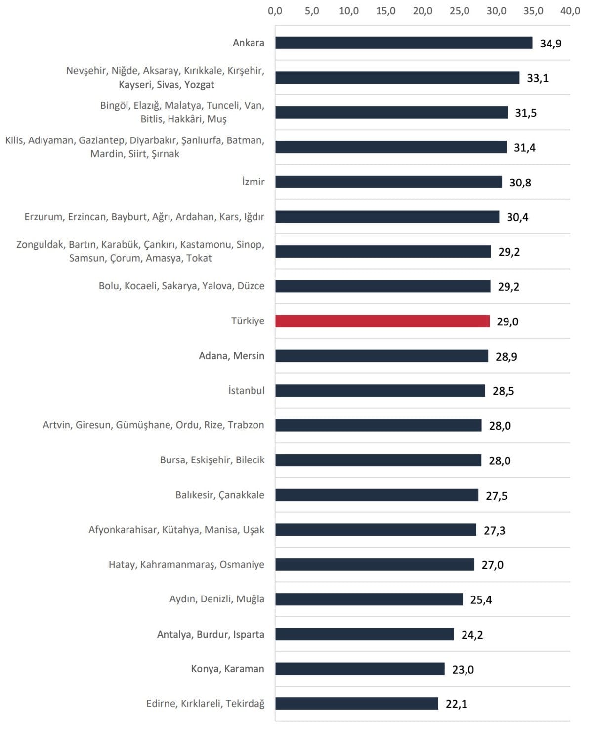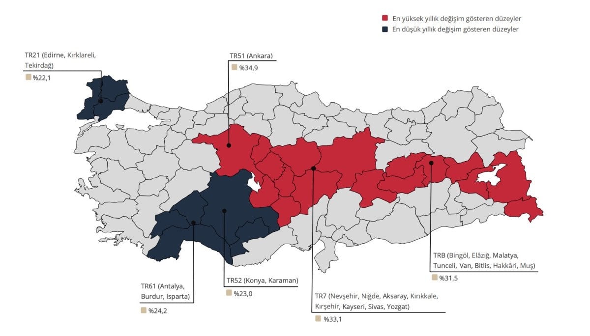 İstatistiki Bölge Birimleri Sınıflamasına göre 2025 yılı Aralık döneminde en yüksek yıllık konut fiyat artışı yüzde 34,9 ile Ankara bölgesinde görüldü. En düşük yıllık artış ise yüzde 22,1 ile Edirne, Kırklareli ve Tekirdağ’ı kapsayan Trakya bölgesinde kaydedildi.