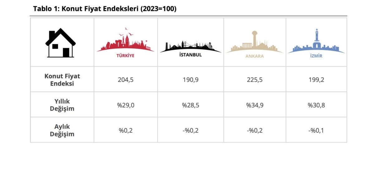 Yıllık değişimler incelendiğinde ise artış eğilimi sürdü. Bir önceki yılın aynı ayına göre konut fiyatları İstanbul’da yüzde 28,5, Ankara’da yüzde 34,9 ve İzmir’de yüzde 30,8 arttı.