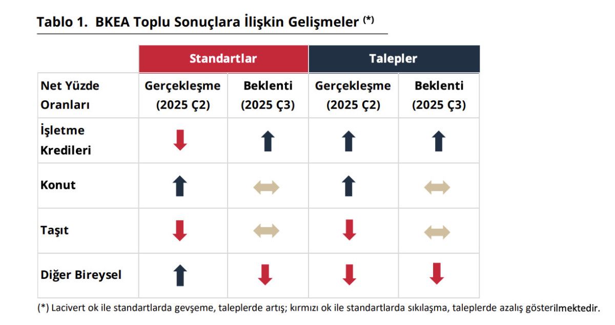 Ankete göre, 2025 yılının ikinci çeyreğinde, bankalar işletmelere kullandırdıkları kredilere uyguladıkları standartları genel olarak sıkılaştırdı. Bu dönemde alt kırılımlar incelendiğinde vade bakımından uzun vadeli kredilere uygulanan standartlar temelde aynı kalırken, kısa vadeli kredilere uygulanan standartların sıkılaştığı, para cinsi bakımından TL kredilere uygulanan standartlarda belirgin bir değişim gözlenmedi.
