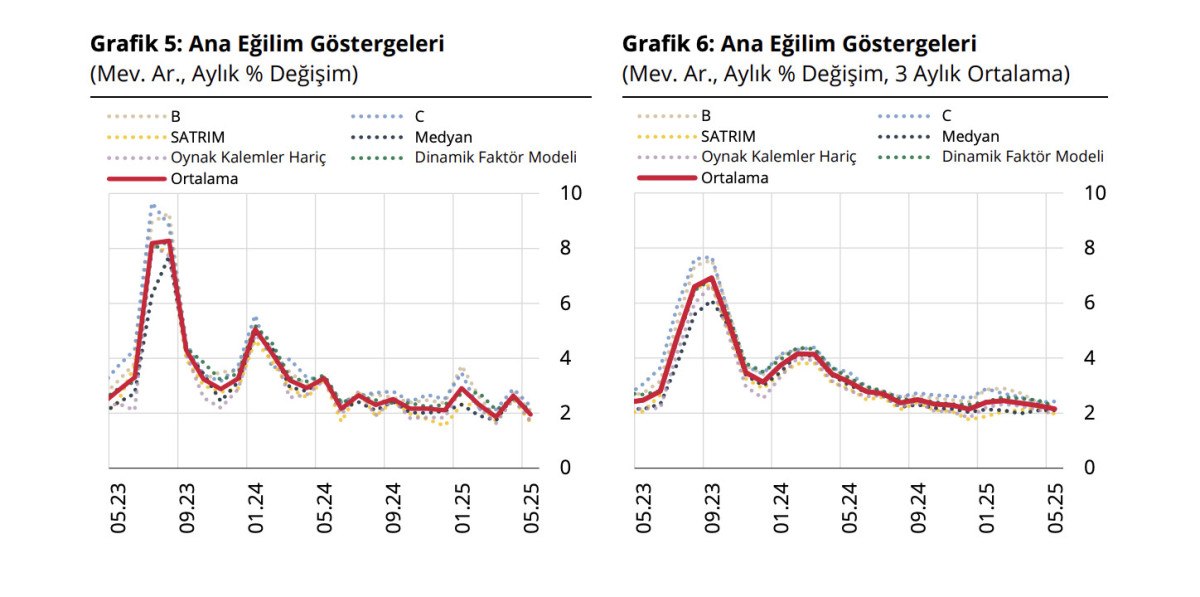 Mevsimsellikten arındırılmış verilerle, tüketici fiyatlarının aylık artışı bir önceki aya kıyasla yavaşladı. Aylık artışlar B ve C göstergelerinde bir önceki aya kıyasla düşüş kaydetti. B endeksini oluşturan gruplar genelinde fiyat artışlarının zayıfladığı gözlenirken, TCMB bünyesinde takip edilen göstergeler, mayıs ayında enflasyonun ana eğiliminde aylık bazda belirgin düşüşe üç aylık ortalamalar bazında ise kademeli bir yavaşlamaya işaret etti.
