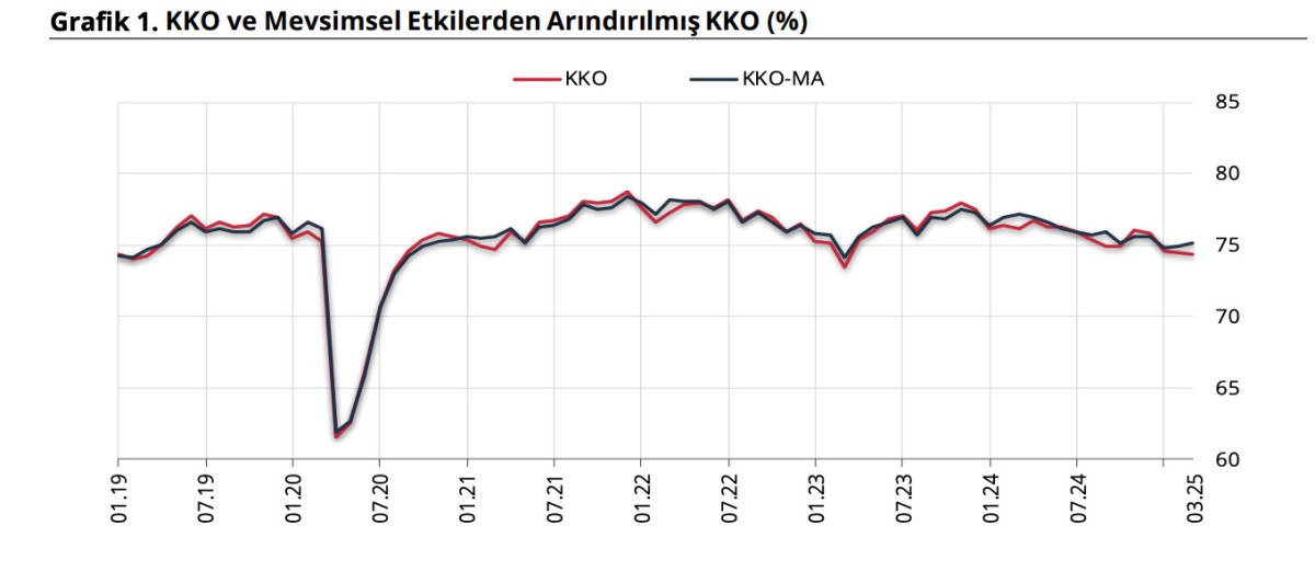 Anket sonuçlarına göre, İmalat sanayisi genelinde kapasite kullanım oranı (KKO) sanayisi genelinde kapasite kullanım oranı, martta geçen aya oranla 0,1 puan azalarak yüzde 74,4 oldu.