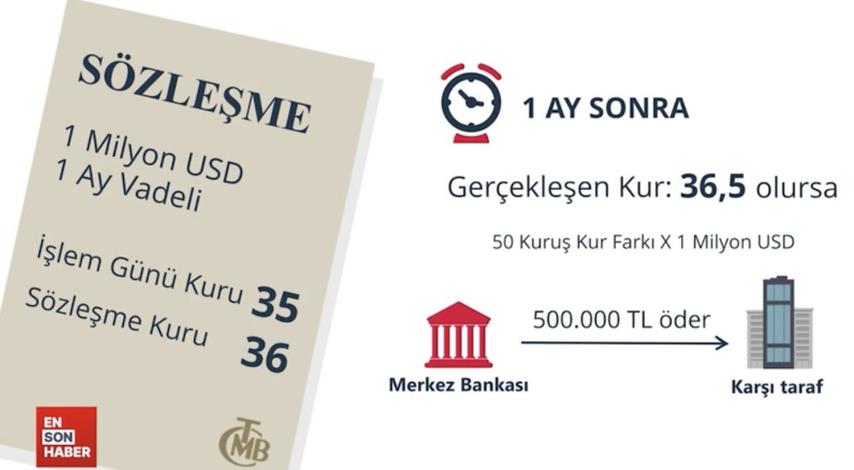Vade bitiminde, yani bir ay sonra, dolar kurunun 36,5 lira olduğu varsayılan videoda, gerçekleşen kur sözleşmede belirlenen seviyenin 50 kuruş üzerinde olduğu için, 1 milyon dolar için oluşan 500 bin liralık farkın Merkez Bankası tarafından karşılanacağı aktarılıyor.