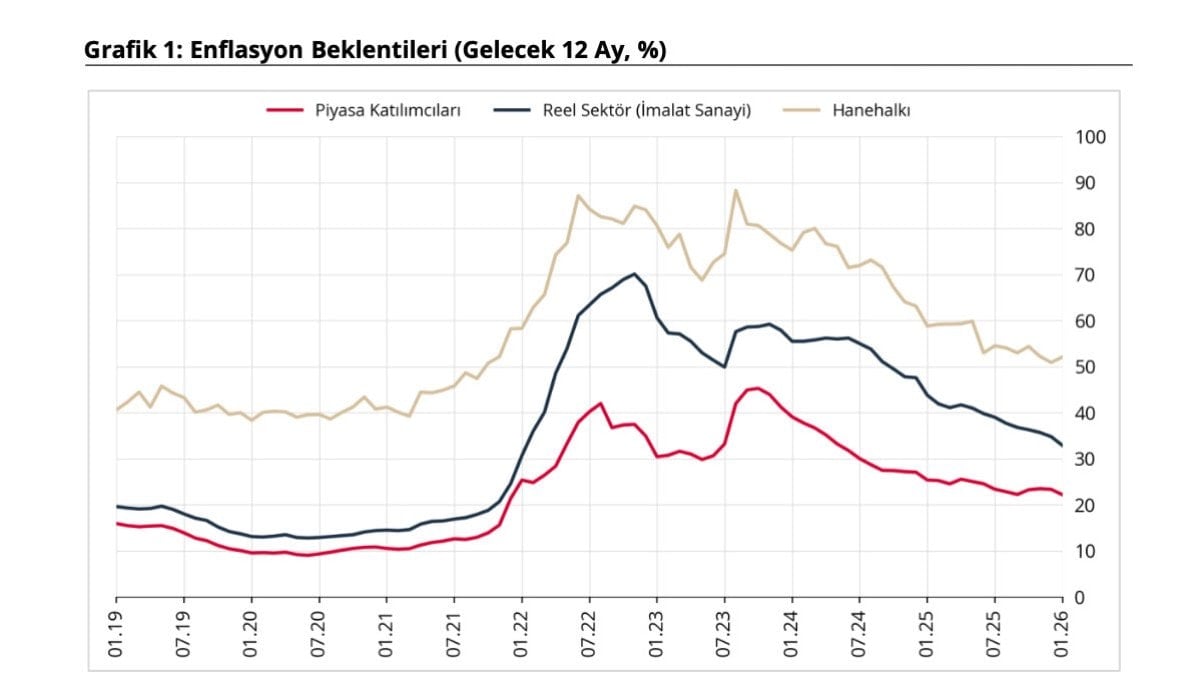 2026 yılı Ocak ayında 12 ay sonrası yıllık enflasyon beklentileri bir önceki aya göre, piyasa katılımcıları için 1,15 puan azalarak yüzde 22,20 seviyesine, reel sektör için 1,90 puan azalarak yüzde 32,90 seviyesine gerilerken, hanehalkı için 1,18 puan artarak yüzde 52,08 seviyesine yükseldi.