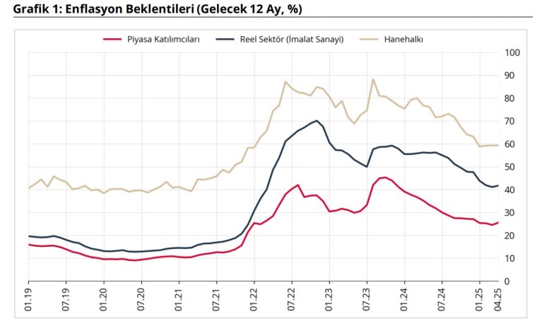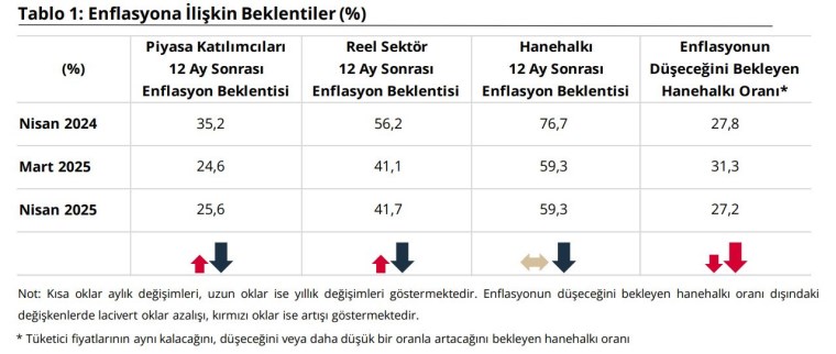 Nisan ayında, 12 ay sonrasına ilişkin yıllık enflasyon tahmini piyasa katılımcıları için yüzde 25,6’ya, reel sektör için yüzde 41,7’ye yükselirken; hanehalkı için ise değişmeyerek yüzde 59,3 seviyesinde kalmıştır.”