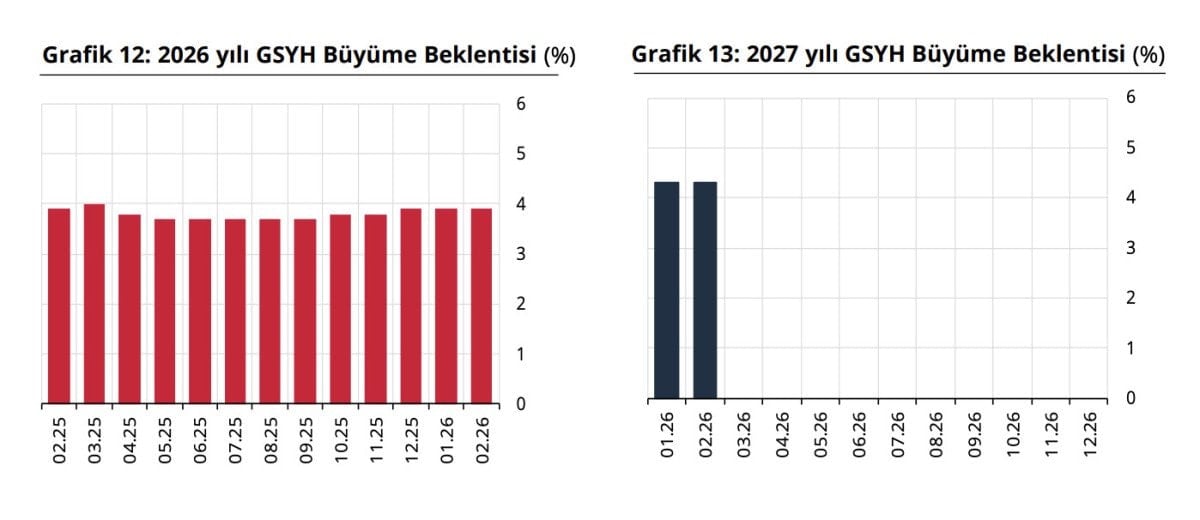 Katılımcıların GSYH 2026 ve 2027 yılı büyüme beklentileri bir önceki anket döneminde olduğu gibi bu anket döneminde de sırasıyla yüzde 3,9 ve 4,3 olarak gerçekleşti.