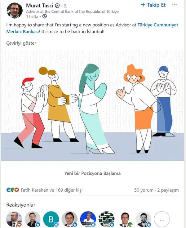 Türkiye Cumhuriyet Merkez Bankası’nda (TCMB) geçtiğimiz hafta göreve başlayan yeni danışmanın JPMorgan geçmişi dikkat çekti. TCMB’nin yeni danışmanı Murat Taşçı, göreve başladığını LinkedIn profilinden duyurdu. Profilindeki tek paylaşım bu olurken, tebrik mesajları arasında TCMB Başkanı Fatih Karahan’ın öne çıktığı görüldü.