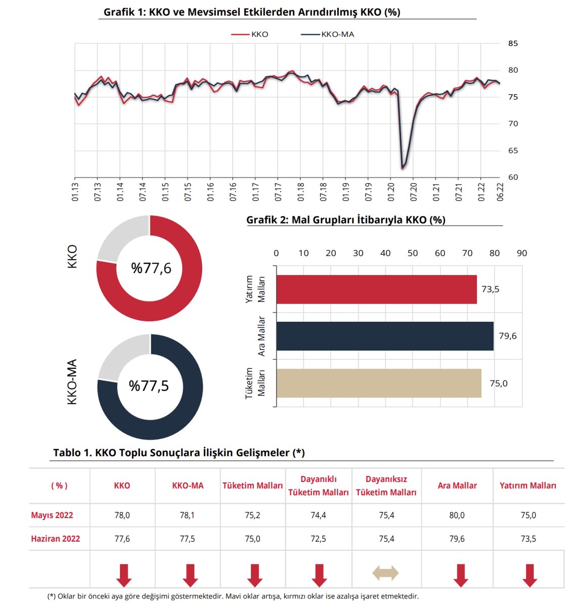 Mevsimsel etkilerden arındırılmış kapasite kullanım oranı (KKO-MA), bir önceki aya göre 0,6 puan azalarak yüzde 77,5 seviyesine geldi.