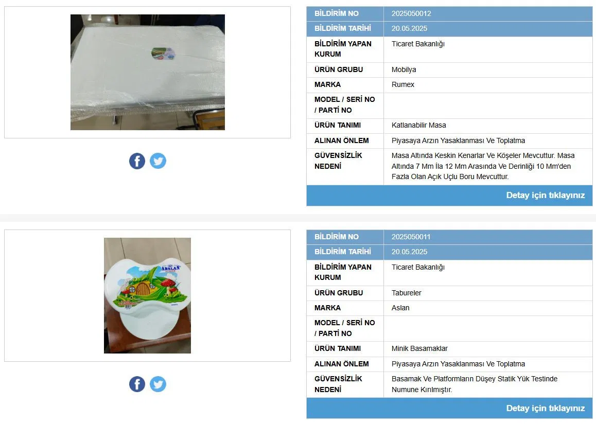 Ticaret Bakanlığı piyasa gözetimi ve denetimi kapsamında yetkili kuruluşlar tarafından güvensiz bulunan ürünleri Güvensiz Ürün Bilgi Sistemi üzerinden duyurmaya devam ediyor.