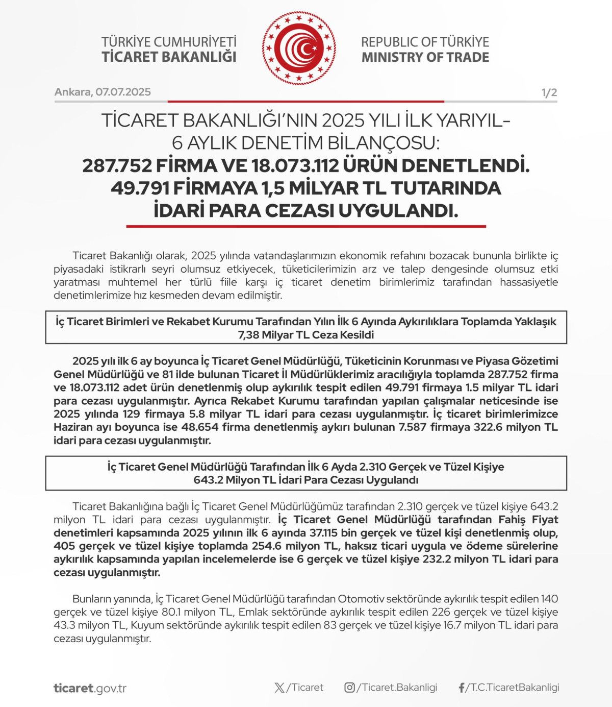 2025 yılı ilk 6 ay boyunca İç Ticaret Genel Müdürlüğü, Tüketicinin Korunması ve Piyasa Gözetimi Genel Müdürlüğü ve 81 ilde bulunan Ticaret İl Müdürlüklerimiz aracılığıyla toplamda 287 bin 752 firma ve 18 milyon 73 bin 112 adet ürün denetlenmiş olup aykırılık tespit edilen 49 bin 791 firmaya 1,5 milyar TL idari para cezası uygulanmıştır.