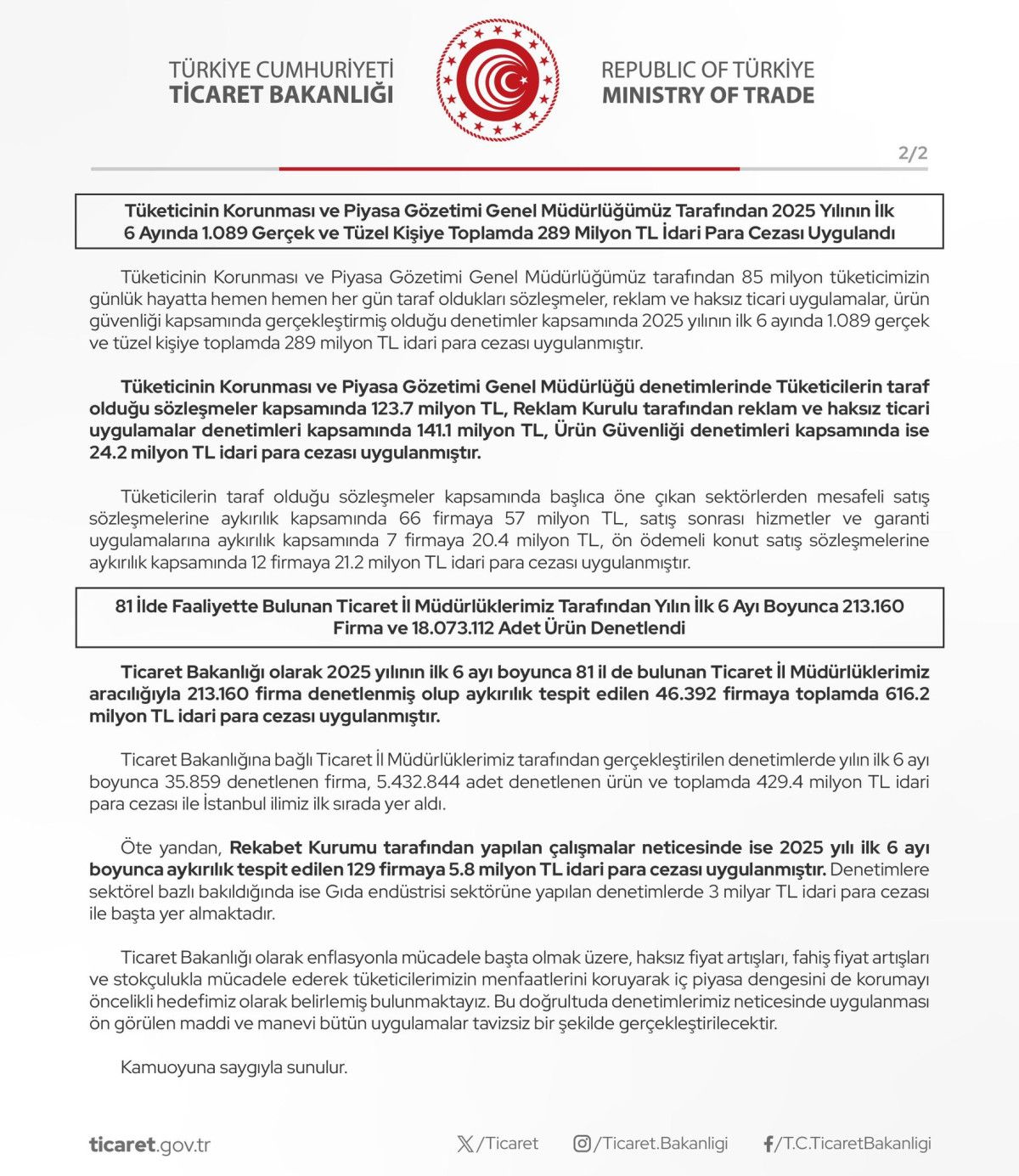 Tüketicinin Korunması ve Piyasa Gözetimi Genel Müdürlüğü denetimlerinde Tüketicilerin taraf olduğu sözleşmeler kapsamında 123,7 milyon TL, Reklam Kurulu tarafından reklam ve haksız ticari uygulamalar denetimleri kapsamında 141,1 milyon TL, ürün güvenliği denetimleri kapsamında ise 24,2 milyon TL idari para cezası uygulanmıştır.